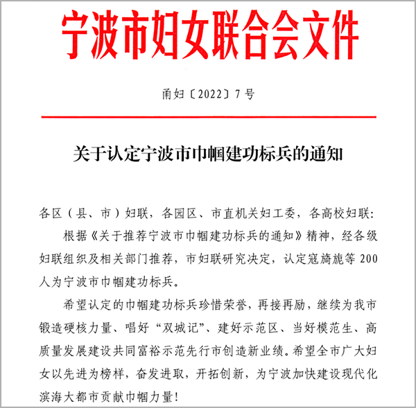 為深入學(xué)習(xí)貫徹習(xí)近平新時(shí)代中國(guó)特色社會(huì)主義思想和黨的十九屆歷次全會(huì)精神,進(jìn)一步鼓勵(lì)廣大婦女愛崗敬業(yè)、創(chuàng)先爭(zhēng)優(yōu),推動(dòng)形成學(xué)本領(lǐng)、提素質(zhì)、講奉獻(xiàn)、比業(yè)績(jī)的良好氛圍,為寧波高質(zhì)量發(fā)展建設(shè)共同富裕先行市貢獻(xiàn)半邊天力量。近日,寧波市婦聯(lián)評(píng)選認(rèn)定了200人為寧波巾幗建功標(biāo)兵,奉化區(qū)11名優(yōu)秀女性獲此殊榮,寧波一機(jī)閥門制造有限公司常務(wù)副總經(jīng)理——梁金寅,成功入選。